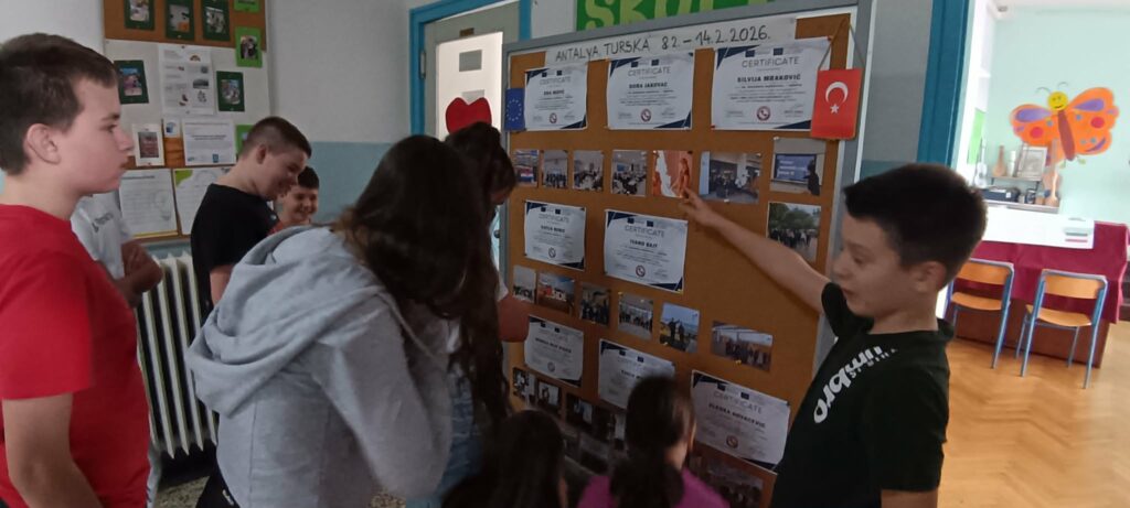 U razdoblju od 9. do 13. veljače šestero učenika osmog razreda – četiri djevojke i dva dječaka – sudjelovalo je u grupnoj mobilnosti u sklopu Erasmus akreditacije. U pratnji učiteljice Alenke Kovačević, pedagoginje Monike Bajt Stepić i tajnice škole Sanje Mulc, učenici su boravili u turskom gradu Manavgatu, Antaliji kao gosti škole Basari Koleji.
